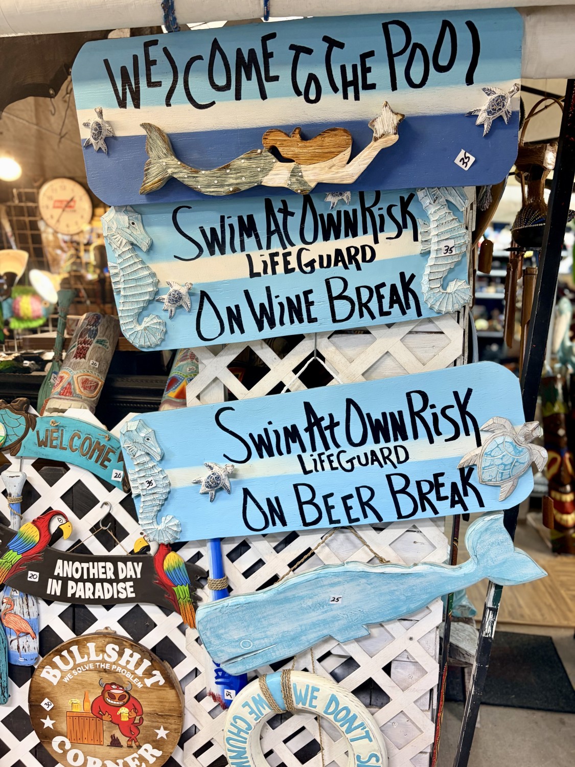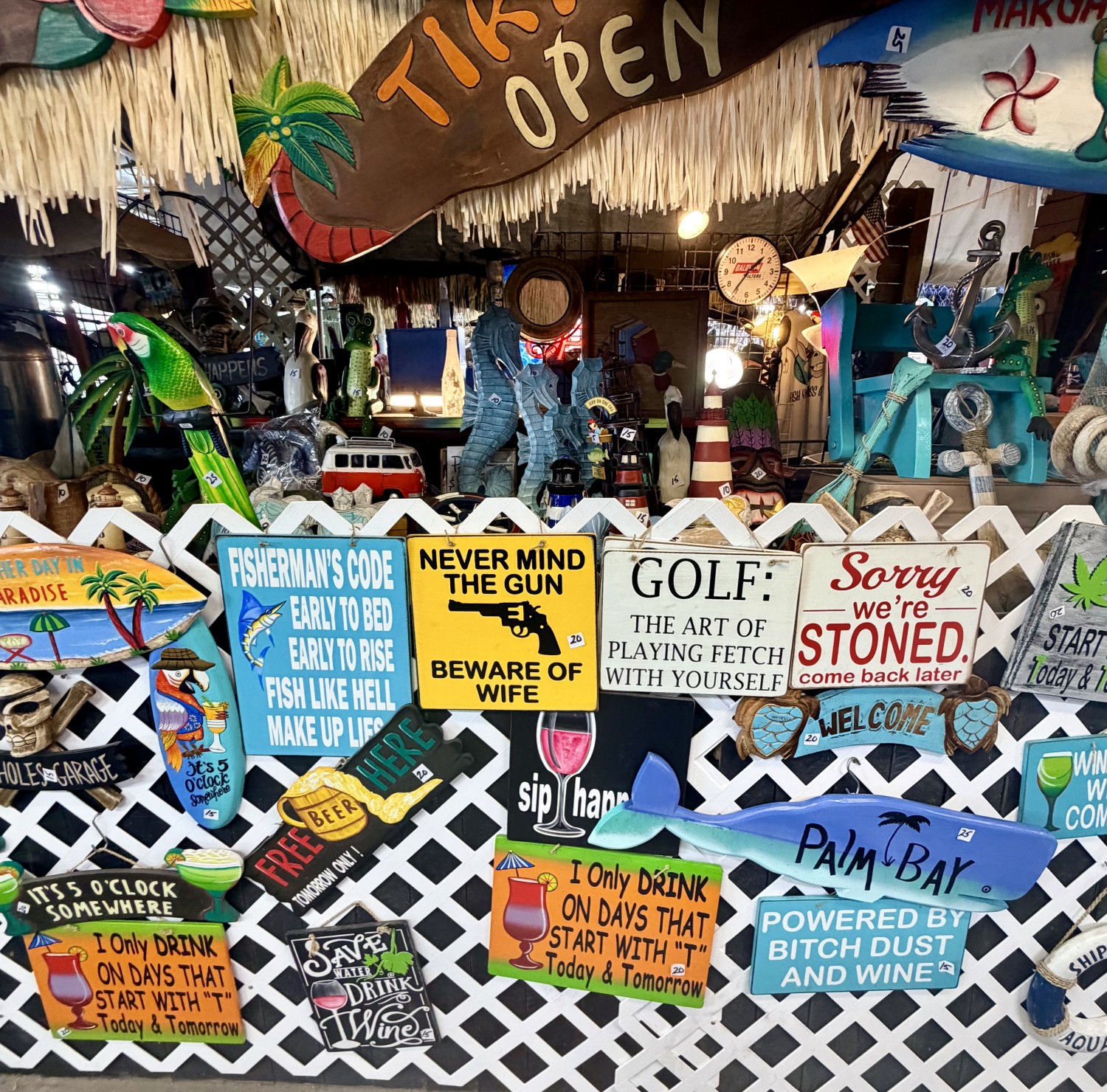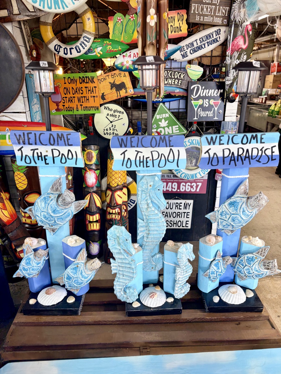 Fla nautical signs, tikis. Carved and painted cement novelties. Gators, angels, crosses. -All made in the USA-
