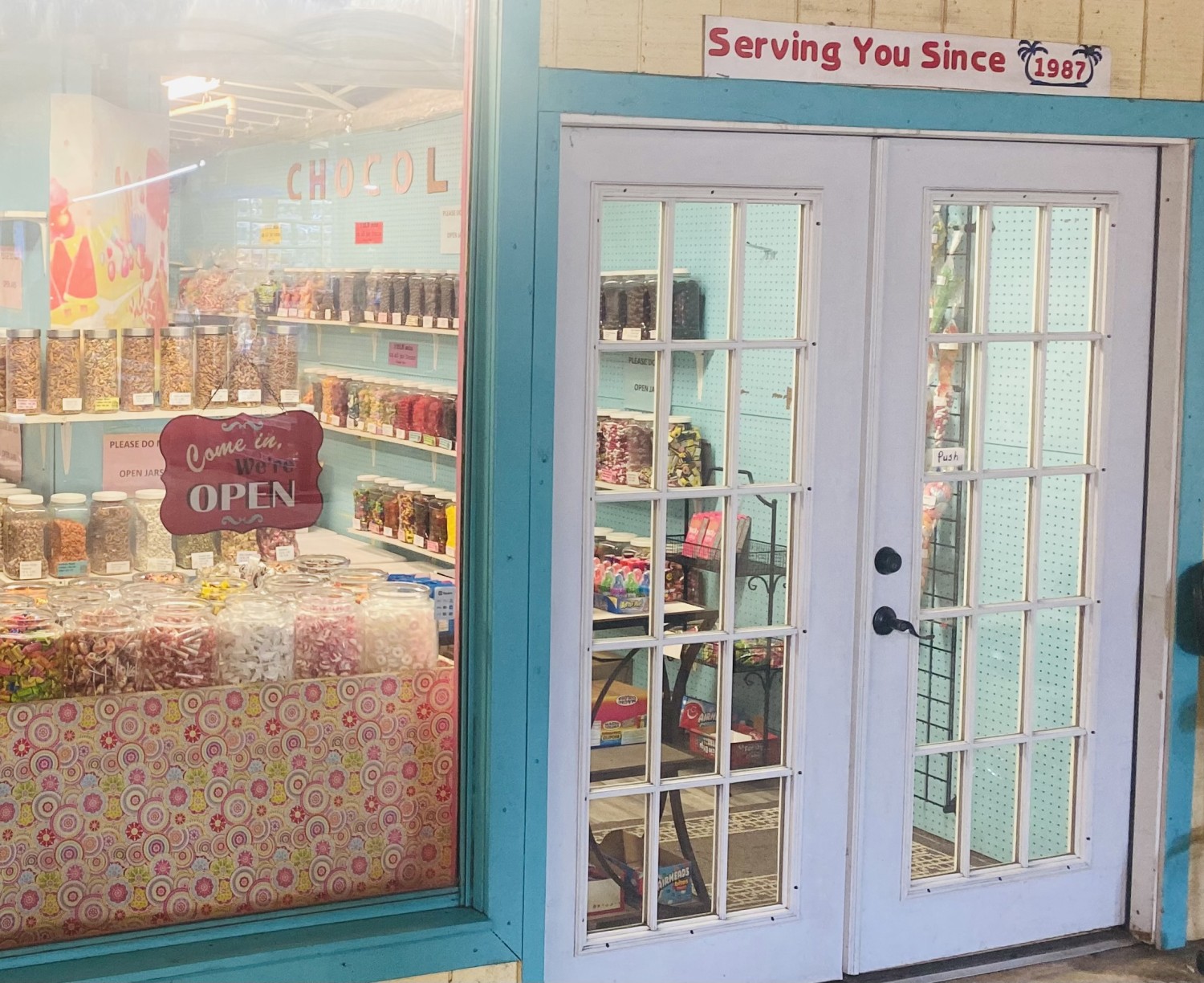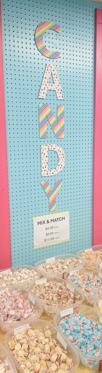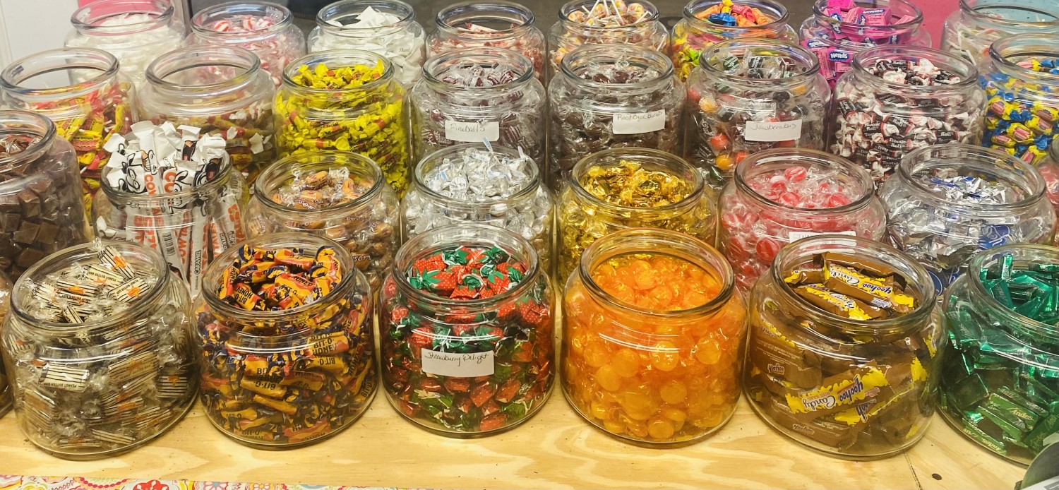 Lg. selection of wrapped and unwrapped candy; some old-fashioned candies, sugar-free and regular chocolates. Good selection of sesame sticks, peanuts, and dried fruits.