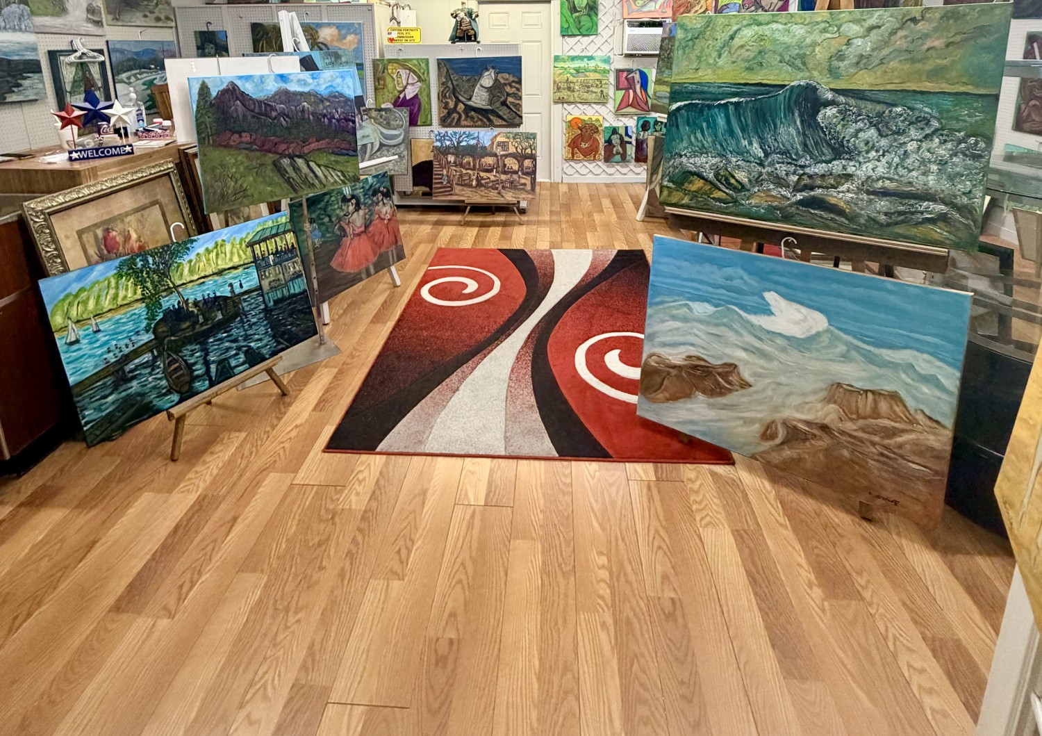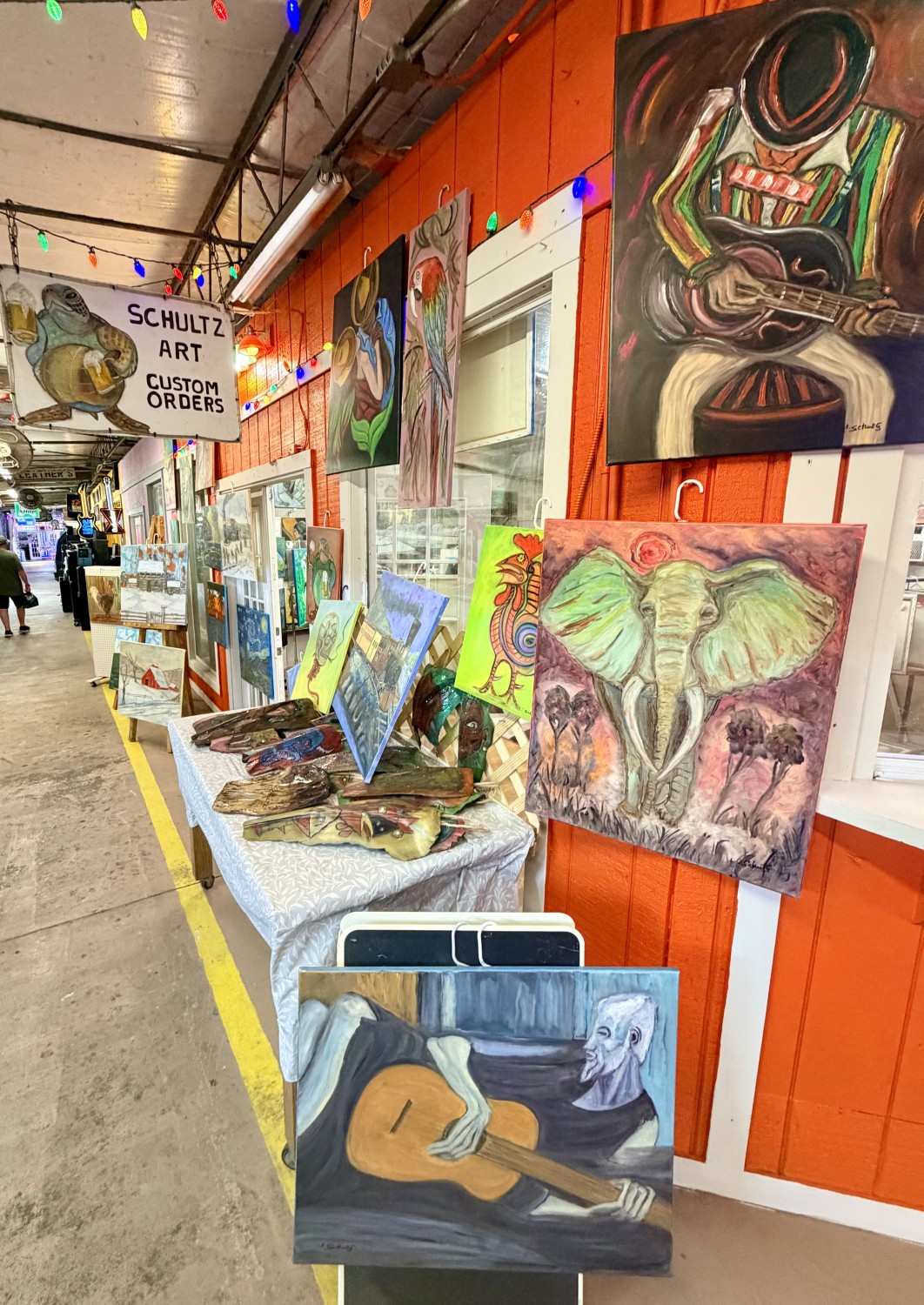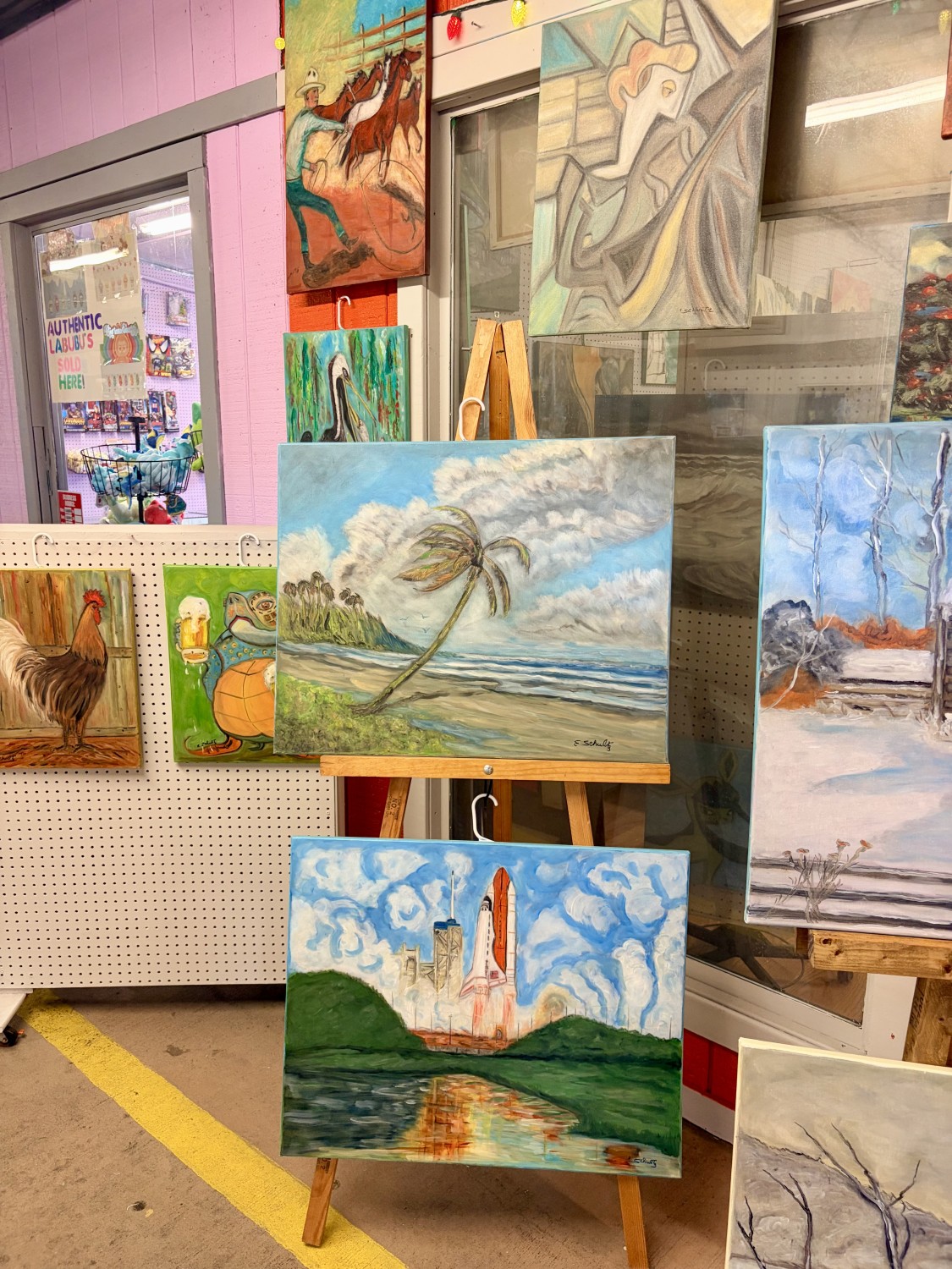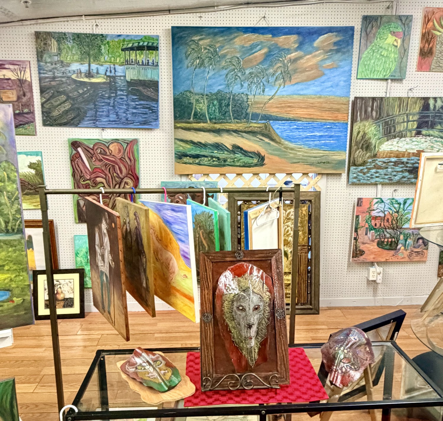 Custom oil paintings. Hand-carved tikis. We take special custom orders. We have Florida art, abstract art, and much more. Artist on site.