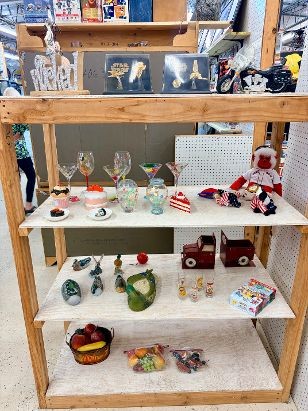 A variety of shells, toys, old games, duck collections & pictures. We also carry a a unique variety of figurines, Monopoly games, baseball cards, Pokemon cards & Mario items.