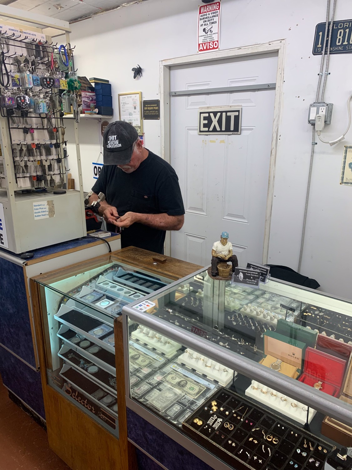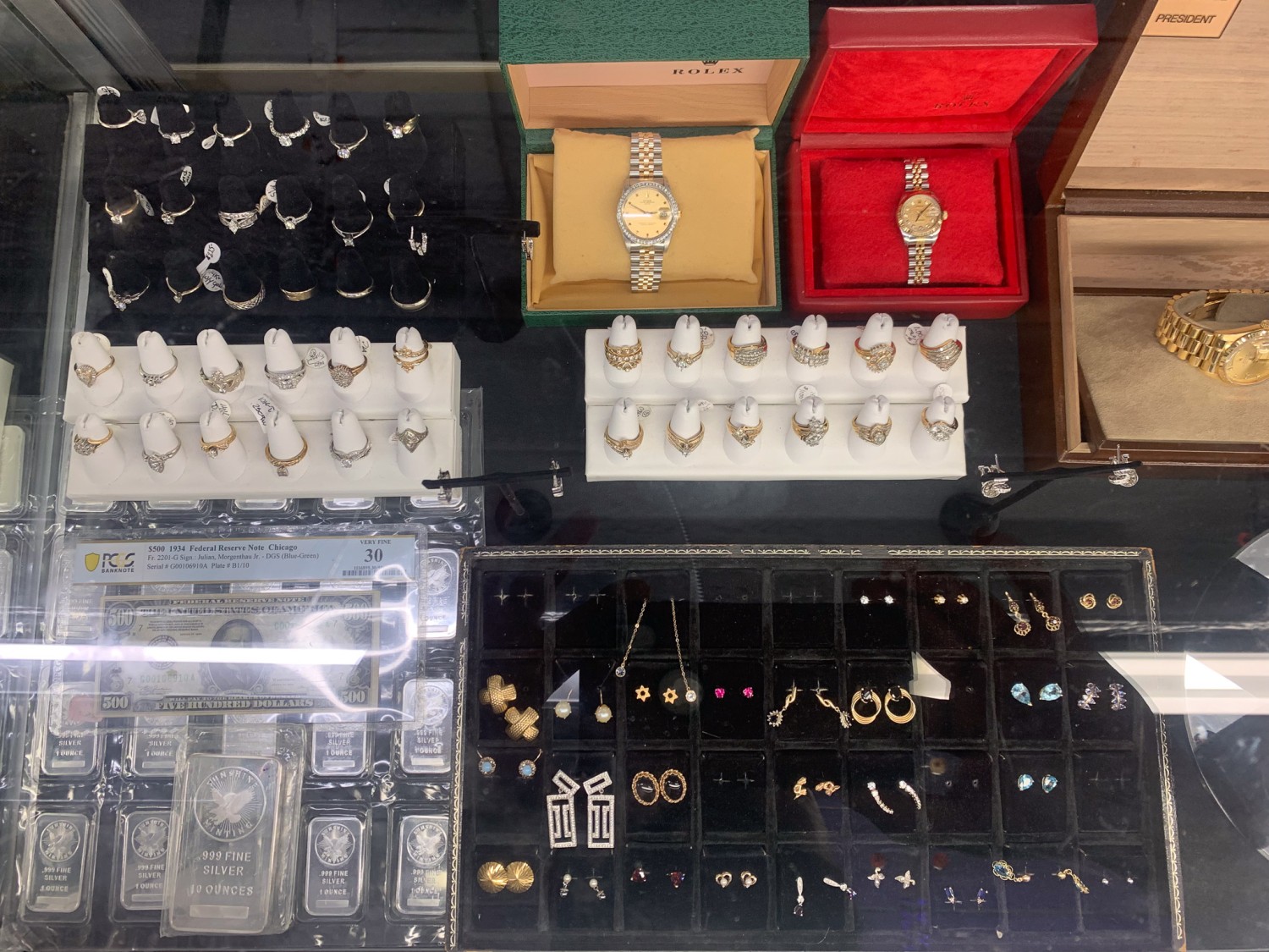 Cash loans on jewelry, coins, sterling silver sets, guitars, keys cut, watch repairs, batteries, straps, crystal replacement, Rolex repair, Rolex watches, stone setting, ring sizing, clasp replacement, chain soldering, jewelry repairs while you wait.